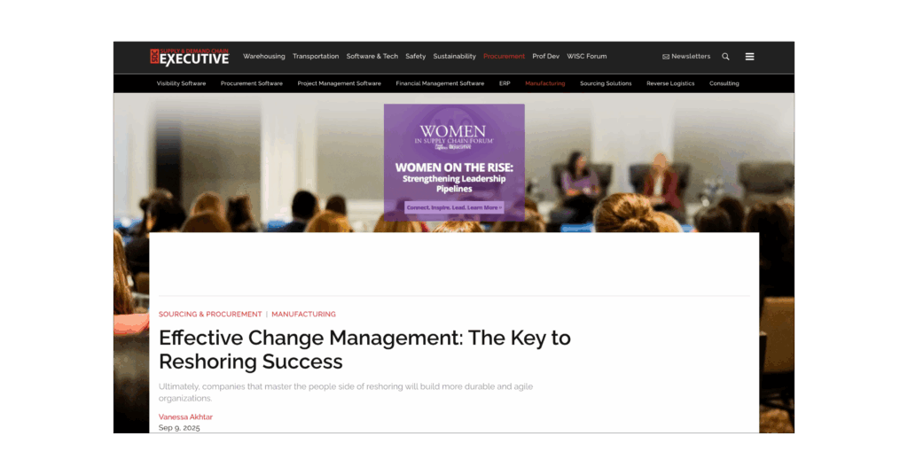 Effective Change Management: The Key to Reshoring Success Culture ChangeDigital TransformationEmployee EngagementEmployee RetentionGrowthInnovationKotter In The NewsKotter InsightsLeadership DevelopmentManufacturingOperational EfficiencyProductivitySupply Chain Effective Change Management: The Key to Reshoring Success Dr. Vanessa AkhtarOctober 8, 2025